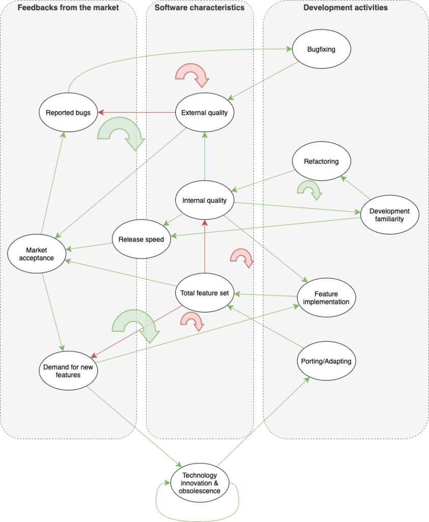 The picture above is a system dynamics diagram for software-intensive systems. Green arrows show positive correlations, while red arrows show negative ones. The variables are also categorized into three areas: feedbacks from the market, characteristics of the software and activities in development. The multi-levels, multi-loops and multi-agents (market vs. software development organization) are also visible in this diagram. A loop with an even number (0 is an even number) of red arrows is a reinforcing loop, while a loop with an odd number of red arrows is a balancing loop. Balancing loops stabilize variables, while reinforcing loops push them in the positive or negative direction.